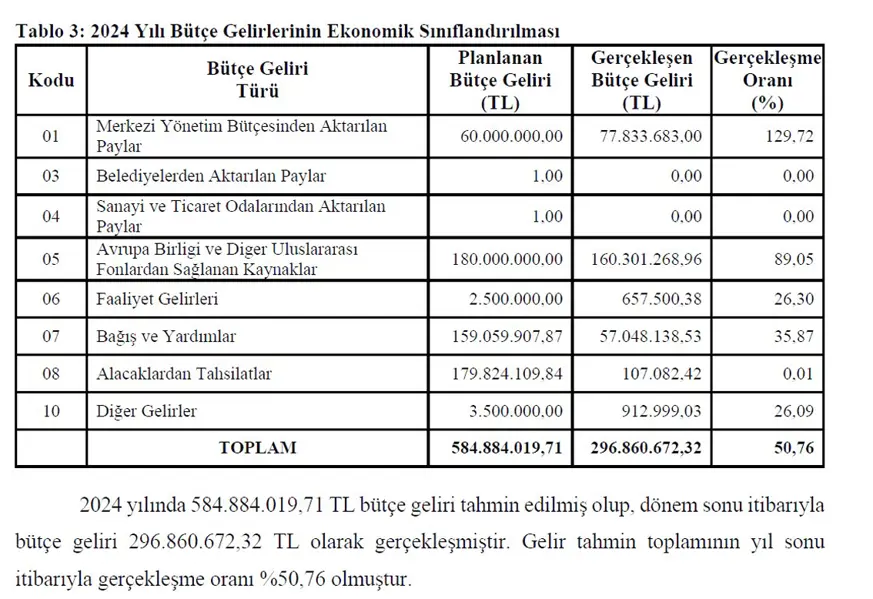 Rapora göre, 2024 yılında Ajansın bütçe geliri 584,8 milyon TL olarak öngörüldü. Ancak yıl sonunda gerçekleşen tutar 296,8 milyon TL ile hedefin yalnızca yüzde 50,7’si oldu.