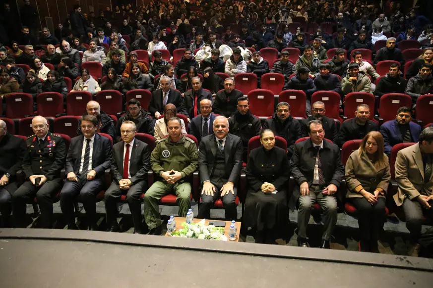 Kültür merkezindeki sahnede Türk bayrağı ile saldırıda yaşamını yitirenlerin karanfillerle süslenen fotoğrafları da yer aldı.