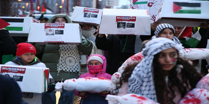 İsrail'in saldırıları sonucu yaşamını yitiren 6 binden fazla Filistinli çocuğa dikkati çekmek için bazı göstericiler kefen giyerken, bazıları da içi doldurulmuş kefen ve çocuk tabutlarını taşıdı.