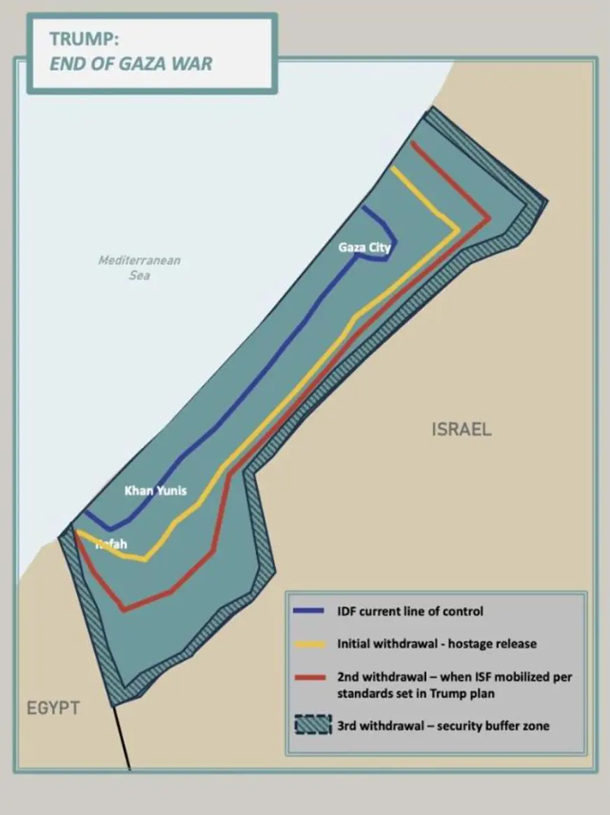 16- İsrail, Gazze'yi işgal ya da ilhak etmeyecektir. ISF kontrolü ve istikrarı sağlarken, İsrail Savunma Kuvvetleri (IDF) Gazze'nin güvenli hale gelmesi ve artık İsrail, Mısır veya vatandaşlarına tehdit oluşturmaması amacıyla IDF, ISF, garantörler ve ABD arasında silahlardan arındırmaya ilişkin olarak mutabık kalınacak standartlar, aşamalar ve takvimler çerçevesinde geri çekilecektir. Uygulamada, IDF işgal ettiği Gazze topraklarını geçiş otoritesi ile yapacağı anlaşmaya göre kademeli olarak ISF'ye devredecek ve böylece süreç, tamamen çekilme gerçekleşene kadar devam edecektir. Ancak Gazze'nin yeniden ortaya çıkabilecek herhangi bir terör tehdidinden tamamen güvenli hale gelmesine kadar bir güvenlik hattı muhafaza edilecektir.