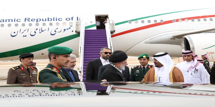 İran devlet televizyonunun haberine göre, Suudi yetkililer tarafından Riyad havalimanında karşılanan Reisi, Filistin'i sembolize eden kefiye ile uçaktan indi.
