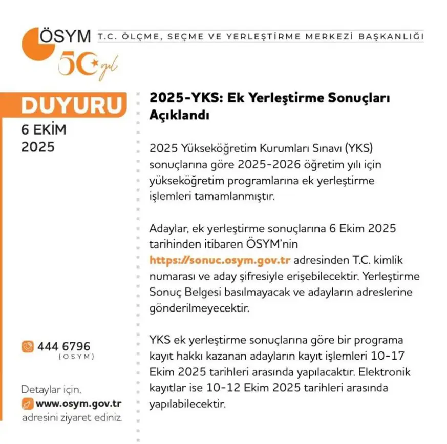 "2025 Yükseköğretim Kurumları Sınavı (YKS) sonuçlarına göre 2025-2026 öğretim yılı için yükseköğretim programlarına ek yerleştirme işlemleri tamamlanmıştır. Adaylar, ek yerleştirme sonuçlarına 6 Ekim 2025 tarihinde saat 16.30'dan itibaren ÖSYM'nin https://sonuc.osym.gov.tr adresinden T.C. kimlik numarası ve aday şifresiyle erişebilecektir. Yerleştirme Sonuç Belgesi basılmayacak ve adayların adreslerine gönderilmeyecektir. YKS ek yerleştirme sonuçlarına göre bir programa kayıt hakkı kazanan adayların kayıt işlemleri 10-17 Ekim 2025 tarihleri arasında yapılacaktır. Elektronik kayıtlar ise 10-12 Ekim 2025 tarihleri arasında yapılabilecektir. Kayıt için adayların yerleştirildikleri yükseköğretim programının bağlı bulunduğu üniversiteye süresi içinde başvurmaları gerekmektedir. Elektronik kayıt yapan adaylar, üniversiteleri tarafından duyurulan tarihe ve ilgili belgelere göre işlem yapacaktır. Ek yerleştirme sonuçlarına ilişkin sayısal bilgiler Ek'te sunulmuştur."