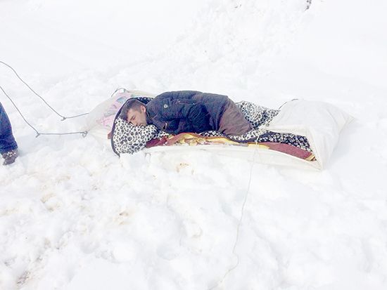 VAN'ın Başkale ilçesi Birifkan mezrasında rahatsızlanan güvenlik korucusu Bereket Duman (36), yolun kardan kapalı olması nedeniyle, yaklaşık 2 kilometre kar üzerinde brandayla çekilerek, ambulansa koyulup, hastaneye götürüldü.