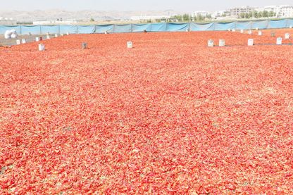 GAP ile birlikte sulu tarımın yaygınlaştığı Şanlıurfa'da ilkbaharda ekilen, bakım ve sulamanın ardından ağustos ayı başında hasat edilmeye başlanan kırmızı renkteki biberler, kamyonlarla pazarlarla getiriliyor.