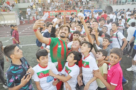 Cizrespor'un 3-0 galip geldiği maç sonunda saha içine koşan öğrenciler Cizresporlu futbolcularla bol bol fotoğraf çektirdi, futbolculardan imza aldı.