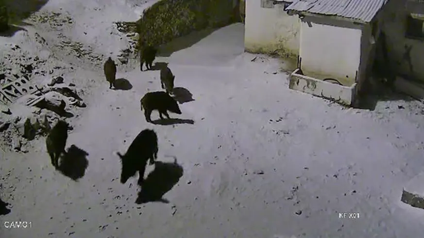 Kar ve soğuk hava nedeniyle kırsalda aç kalan yaban domuzları, Hacıhüseyinler köyüne inerek, evlerin çevresinde yiyecek aradı. O anlar güvenlik kamerasınca kaydedildi. Köy muhtarı Hasan Yıldırımdiç, AA muhabirine, son yıllarda bölgede çok sayıda yaban domuzu görülmeye başlandığını söyledi.